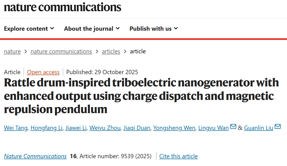 针对传统技术低频海洋波浪能采集效率低的瓶颈问题,蓝色能源团队提出拨浪鼓式TENG(RD-TENG),通过三电极与交替覆膜策略实现高密集摩擦层间的电荷调度,使外电极输出提升超过6倍。引入降频增幅磁斥力摆(MRP),有效转化低振幅高扭矩波浪激励为高振幅低扭矩摆动,运动振幅和输出性能分别提升558%与1662%,在低海况下实现稳定发电。团队系统完善了涵盖结构、电学与应用导向的综合评价体系,为波浪能TENG在复杂海况下的高效采集及产业化应用提供了重要参考。论文发表于国际著名期刊《自然通讯》(Nature Communications,2025,16,9539),第一作者为2025级博士生唐卫,通讯作者:万玲玉、刘官林,广西大学为唯一通讯单位。