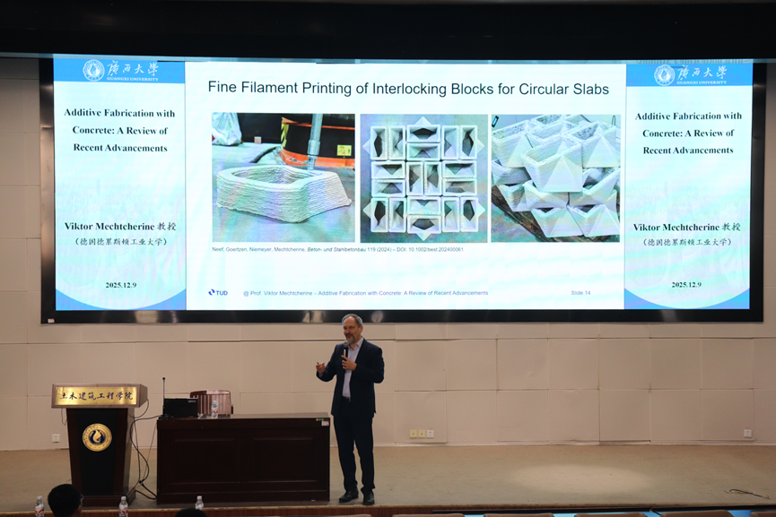 2025年12月9日上午9:00,我院主办的“西大双碳讲坛”第十四期暨“海外名师大讲堂”活动在大型结构试验研究平台第六报告厅顺利举行。德国德累斯顿工业大学Viktor Mechtcherine教授以《Additive Fabrication with Concrete: A Review of Recent Advancements》为题系统讲解了混凝土增材制造与3D打印技术的前沿进展。我校土木建筑工程学院副院长杨海峰教授主持活动,二百余名师生现场参与学习交流。